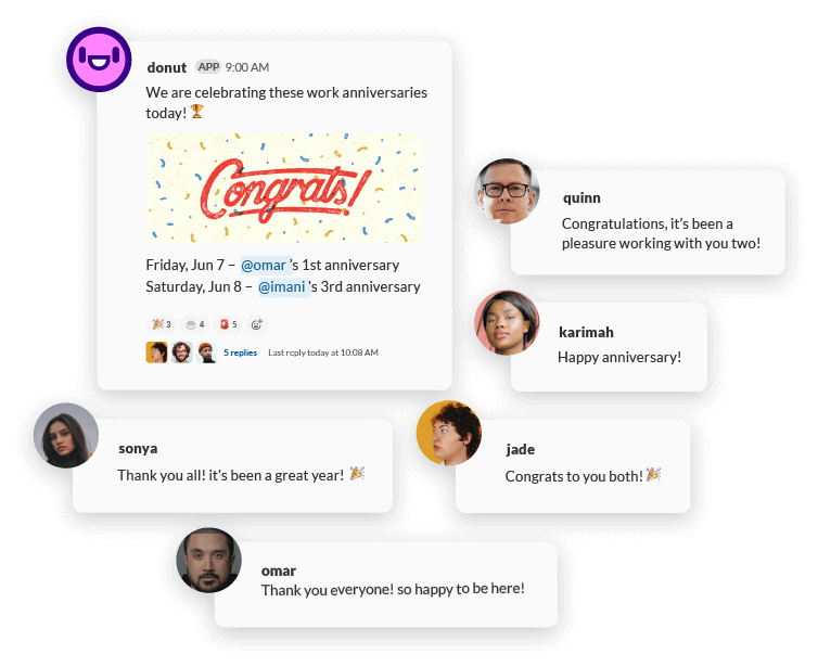 Donut Celebrations features customizable, automated posts in the channel of your choice for birthdays, anniversaries, and holidays.