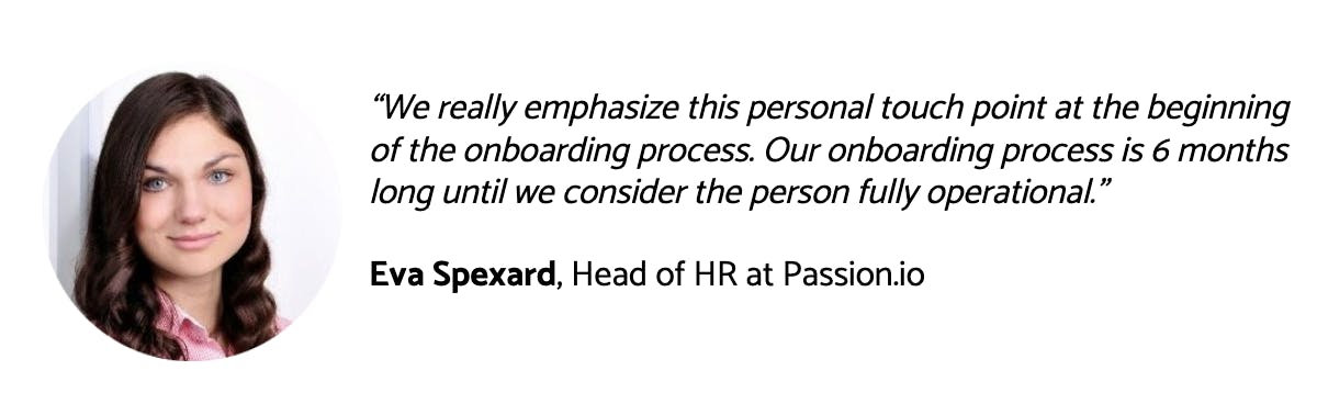 The fully remote company Passion.io has a unique onboarding process that strongly focuses on a personal connection so that the new hire has a feeling of safety and belonging from day one. They refer to managers as Career Coaches, again showing how much they value integration, growth, and personal development throughout all stages.